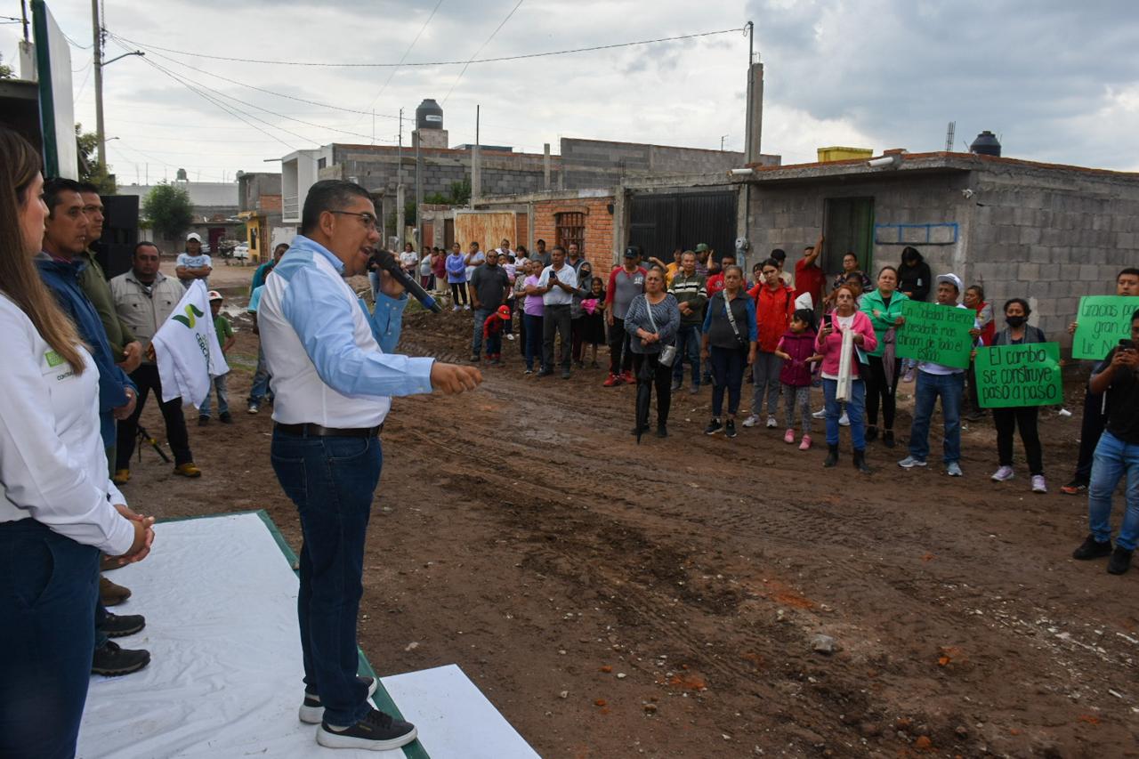 En continuidad del Plan de Pavimentación Total, Juan Manuel Navarro Muñiz, Alcalde de Soledad de Graciano Sánchez, acompañado de vecinos y vecinas de la colonia