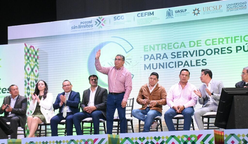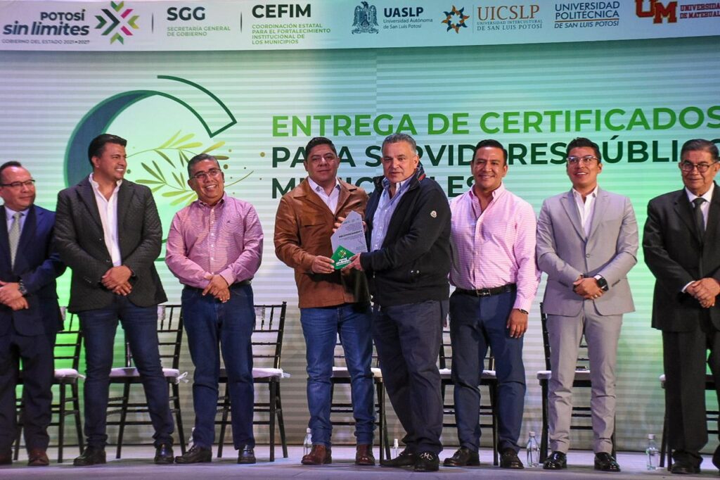 En una ceremonia liderada por el Gobernador del Estado, Ricardo Gallardo Cardona, el Presidente municipal de Soledad de Graciano Sánchez, Juan Manuel Navarro Muñiz recibió el reconocimiento por parte de la Coordinación Estatal para el Fortalecimiento Institucional de los Municipios (CEFIM), que avala la certificación de funcionariado de áreas claves del Ayuntamiento, en temas estratégicos para promueven un servicio público cercano, resolutivo y de inmediatez a la población.