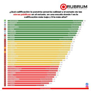 De igual manera, el estado se posicionó a la cabeza en el rubro de obras públicas con un puntaje de 7.28. Esta evaluación responde a la política de fortalecimiento de la infraestructura en las cuatro zonas de la entidad, estrategia que ha incrementado la competitividad estatal y su atractivo para la inversión productiva.