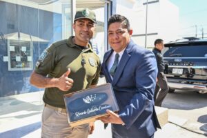 Tras el evento, dónde las y los elementos de seguridad mostraron su gratitud, el oficial Óscar Alejandro García Cerda, instructor de la academia de seguridad y artesano del calzado, se acercó al Gobernador para reconocerle el apoyo hacia la corporación y le obsequió un par de zapatos, como agradecimiento.