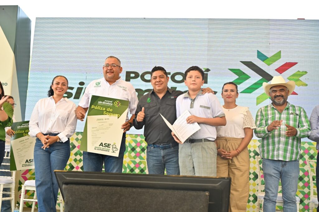 Entre aplausos y porras de las familias, con el entusiasmo de la niñez y juventud, en la cabecera municipal Gallardo Cardona entregó las pólizas del programa Apoyo Seguro al Estudiante (ASE) que brinda atención ante cualquier accidente a todas y todos los estudiantes desde kinder hasta secundaria.