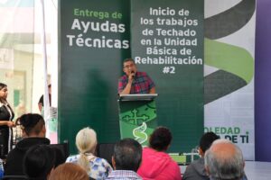 – Con inversión superior a un millón de pesos inició la construcción de techado en la Unidad Básica de Rehabilitación II, además de entregarse sillas de ruedas, andaderas y aparatos auditivos.