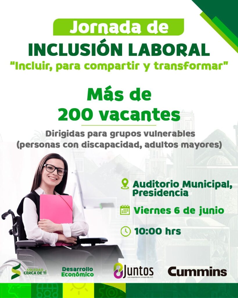 Como parte de la estrategia para fortalecer la economía de las familias soledenses, especialmente de las más vulnerables y facilitar el acceso a un empleo digno y bien remunerado, el Alcalde, Juan Manuel Navarro Muñiz anunció la realización de la Jornada de Inclusión Laboral, este próximo viernes 6 de junio a las 10 de la mañana en el Auditorio Municipal, en la que se ofertarán hasta 200 vacantes en distintas compañías y empresas.