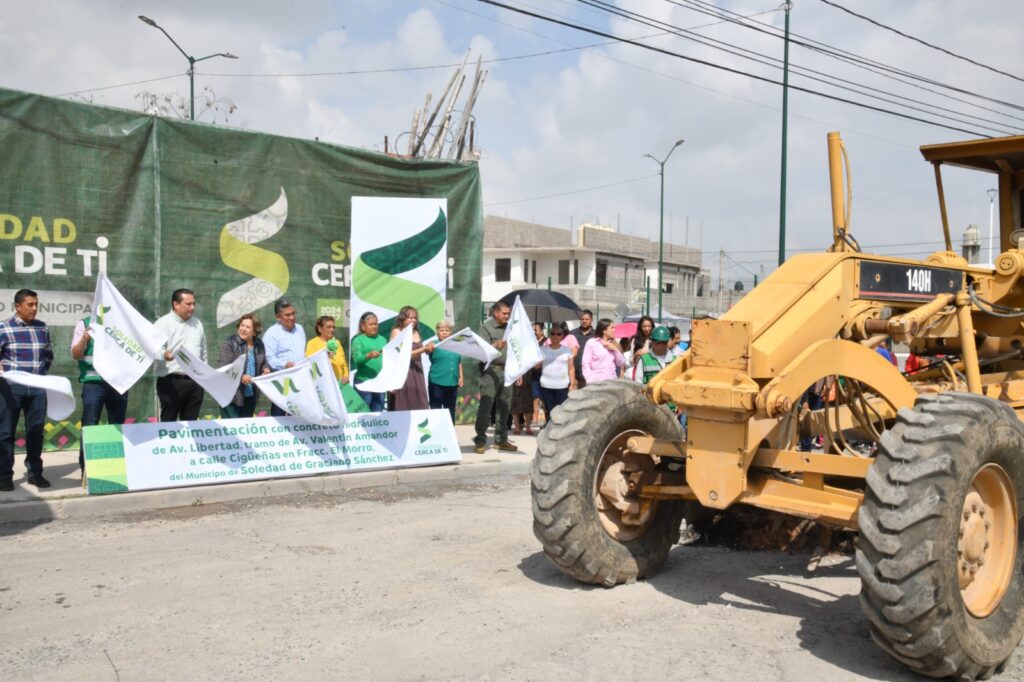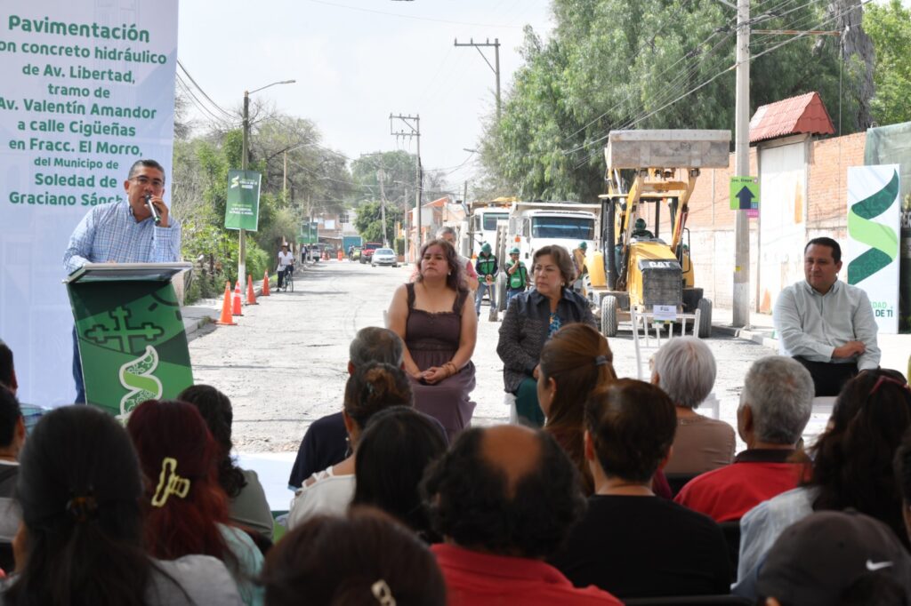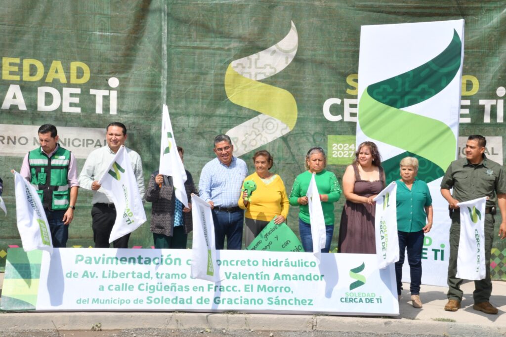Juan Manuel Navarro Muñiz, Alcalde de Soledad de Graciano Sánchez, dio arranque a los trabajos de pavimentación con concreto hidráulico de la Avenida Libertad, en el tramo que va de Avenida Valentín Amador a la calle Cigüeñas, en la colonia El Morro, que beneficiará directamente e indirectamente a más de 26 mil habitantes, y representa una respuesta firme del Gobierno Municipal al compromiso de transformar vialidades deterioradas en espacios modernos, seguros y funcionales para las familias soledenses.