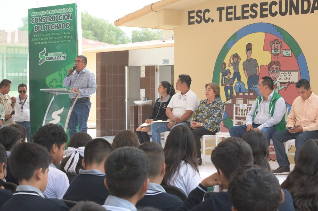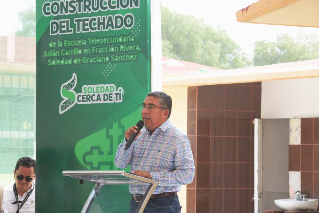 Con una inversión superior a los dos millones de pesos, el Alcalde de Soledad de Graciano Sánchez, Juan Manuel Navarro Muñiz encabezó el arranque de la construcción de un techado tipo II en la cancha deportiva de la escuela Telesecundaria “Julián Carrillo2, ubicada en la localidad Fracción Rivera, que beneficiará directamente a cientos de estudiantes, quienes ahora contarán con un espacio digno para realizar actividades físicas sin verse afectados por las inclemencias del tiempo.